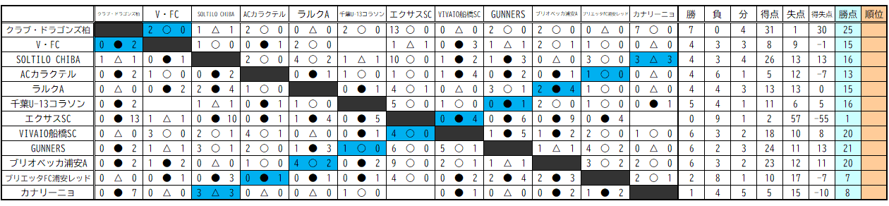 2025-2026 第16回 千葉県ユース(U-13)サッカーリーグ 星取表(1部)